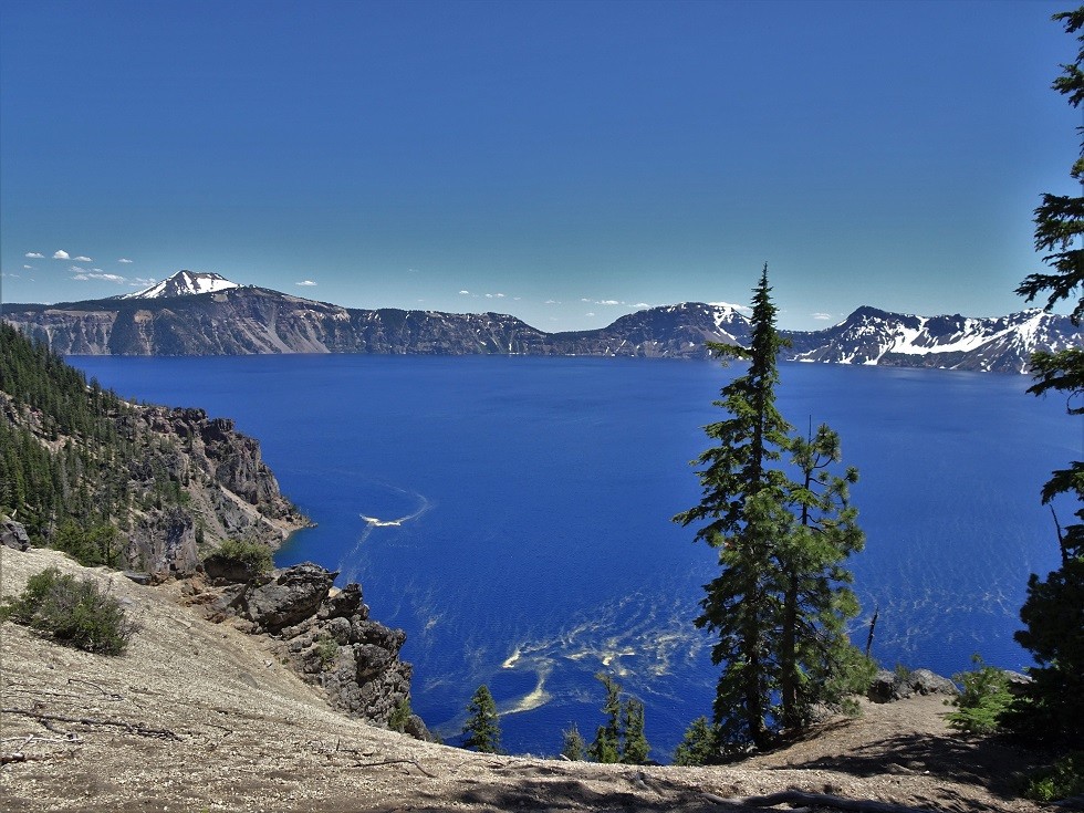 Als je in je vorige verhaal schrijft dat het overal zo rustig is, dan weet je wat je te wachten staat. Een enorm druk park! We staan in file voor het tolpoortje naar Crater Lake. Nog voor we het park in zijn zien we al een enorme sneeuwschuiver met sneeuwkettingen om. We besluiten eerst te stoppen bij het bezoekerscentrum en staan in de file op zoek naar een parkeerplaats. Eénmaal aangekomen in het gebouw staan we in de file voor informatie. De weg door het park is grotendeels geopend, maar 90% van alle wandelroutes zijn helaas gesloten. Dat wordt voornamelijk genieten vanuit de auto en de vele uitzichtpunten. Onze eerste stop is bij Rim Village waar het ook weer speuren is naar iemand die het parkeerterrein wil verlaten. We hebben vanaf hier voor het eerst zicht op het meer. Iedereen die wij tegen komt vertelt dat we verstelt zullen staan van de blauwe kleur van het water en dat klopt. De vele plaatjes die ik heb gezien geven nog steeds niet een goed beeld weer van de werkelijkheid. Je moet dit echt met eigen ogen zien. Het water van het meer is niet alleen intens blauw, maar op sommige plekken heel geel. Misschien heeft het te maken met zwavel o.i.d. omdat het een vulkaan is? Niet alleen het water is zo blauw. Alles lijkt hier intenser van kleur. De bomen zijn extra groen en het mos is bijna fluorescerend groen.