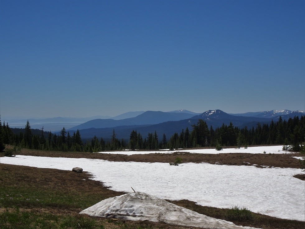De weg naar Crater Lake (west ingang) doet ons erg denken aan Zweden. We rijden door dennenbossen met op de grond allemaal bessenstruikjes. De weg slingert al snel omhoog en we zien de eerste sneeuw. Onderweg hebben we prachtige vergezichten en de temperatuur loopt gelukkig niet te hard op. Het is “slechts†80 graden in plaats van 90.