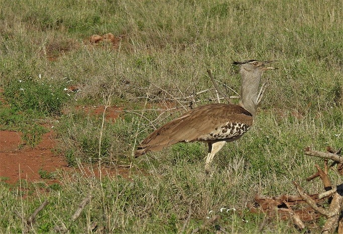 We rijden nog langzamer dan een slak door het park en op deze manier komen we pas op het heetst van de dag aan bij de hut. Iedereen kan dan wel bedenken dat alle vogels dan al lang weg zijn. Al we ons aan het snelheidslimiet hadden gehouden waren we al lang bij de hut geweest. Om twaalf uur zijn we eindelijk bij Orpen Dam. In al die uren hebben we krap 50 kilometer afgelegd. De hut blijkt ook nog eens een viewpoint te zijn en geen specifieke vogelhut. Er vliegt welgeteld één vogel rond en nu krijgen we twee uur de tijd om hier te vogelen. Gelukkig trekt een groepsgenoot haar mond open na een uur en gaan we weer verder. De timing was precies goed, want als we de hut verlaten zien we vanuit de bus een hele kudde olifanten dicht bij de bus. De olifant tettert en wappert met zijn oren. Ik dacht dat hij misschien boos was, maar dit was een signaal om alle olifanten op te trommelen. Het is een kudde met een aantal jonge olifanten. Alle olifanten gaan in een cirkel om de jonge olifanten staan om ze te beschermen. Een prachtig gezicht. Bij een klein plasje water zien we een “nest†van de Foam Frog. Het is een witte bal in een struik gemaakt door een heel klein kikkertje. Als de kikkers uit komen banen ze zich een weg door de bal en vallen dan zo naar beneden in het water, tenminste als de plas water er dan nog is. Het is heel bijzonder.