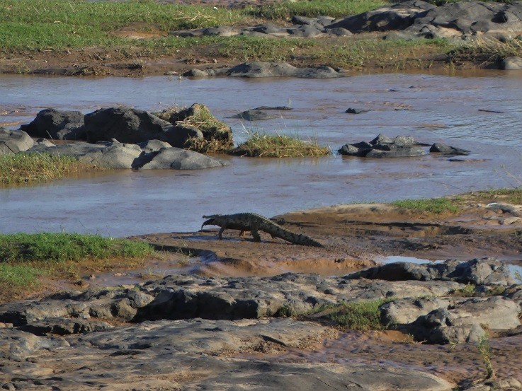 Ik ben zo klaar met deze rot bus en vervelende reisleider dat ik niet te genieten ben. Ik heb geen idee hoe ik deze reis moet doorbrengen. In de bus is het zeker 35 graden. Met maximaal 30 kilometer hobbelen we verder en we zien nog steeds nauwelijks dieren. Als er wel iets te zien is zie ik nauwelijks wat vanaf deze plaats. Als de reisleider vertelt dat we bijna bij een rest camp zijn voor een korte plaspauze ben ik blij. Even naar buiten om de benen te strekken. Mijn benen en voeten zijn helemaal opgezet van de hitte. Helaas blijk “bijna†hier iets anders te betekenen. Het is nog een uur rijden. Het is pas half vier al we daar vertrekken en we moeten nog 70 kilometer afleggen. Ik stap op de reisleider af met de vraag of hij er voor kan zorgen dat we voor het donker bij het kamp zijn. Als we op deze manier door hobbelen duur het nog zeker 3 uur. We zitten midden in de natuur en zouden dan pas in het donker aan komen. Het antwoord geeft weinig hoop. In overleg met de groepsgenoten stappen we nog een keer op de reisleider af en moeten hem bijna smeken om harder te rijden zodat we voor het donker op onze bestemming aan komen. Het moet niet gekker worden. Gelukkig gebeurt dat ook, maar juist nu zien we allemaal wild en wordt het landschap steeds mooier. We rijden een heel stuk langs een rivier waar hele groepen nijlpaarden zwemmen. Een aantal komen ook uit het water. Een gigantische krokodil loopt over het land met een prooi in zijn bek. Verderop lopen allemaal olifanten langs de weg en zelfs twee struisvogels. Hele kuddes met gnoe's op korte afstand en een aantal prachtige roofvogels. Het is te merken dat de zon al langzaam onder gaat en de dieren weer tot leven komen. Gelukkig hebben we toch een mooie afsluiting van de dag gehad.