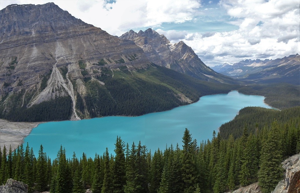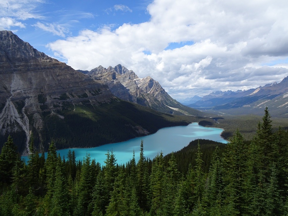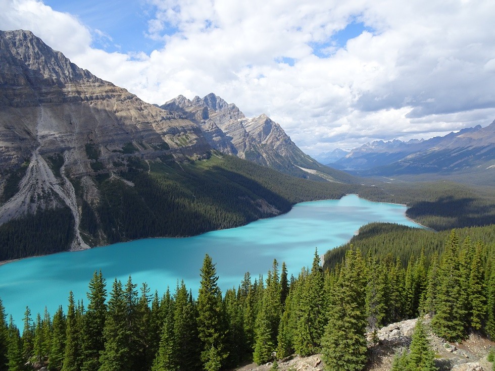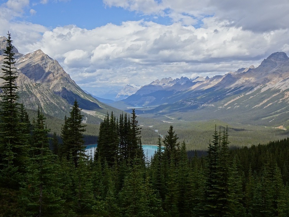 Aangezien we vandaag alle tijd hebben stoppen we bij alle uitzichtpunten die we tegen komen. De eerste is al vrij snel bij Herbert Lake. Het zonnetje schijnt alweer volop en de dennenbomen weerspiegelen mooi in het water. Het water lijkt daardoor nog groener dan het al is. De route gaat verder over de Icefields Parkway. Het is echt prachtig om hier te mogen rijden. Het volgende meer dat we bekijken is Hector Lake. Bij dit meer zien we de bergen weerspiegeld in het water. De weg gaat verder langs een rivier die prachtig blauw is en door het dal meandert en uit komt in Bow Lake. Een heel groot meer met wederom blauw water. Bij de Num-Ti-Jah Lodge parkeren we de auto en lopen langs het water. Er liggen wat kiezels waardoor het net mini-strandjes lijken. Het is bijna een tropische bestemming. Onze jassen verraden dat het niet zo heel warm is. Al verwarmt het zonnetje ons heerlijk. We lopen over houten bruggetjes, steken een rivier over en zien een gletsjer in de verte. Wauw, wat is het hier prachtig. Er staan rode stoelen pal in het zonnetje. Mij krijg je hier niet meer weg. Het weer denkt er anders over. Dikke wolken trekken over en het wordt een stuk frisser. Wij hopen dat ze snel over waaien, want we rijden door naar Peyto Lake, wat zeer hoog staat op ons lijstje. Wij hebben geluk dat we het meer nog kunnen zien. Het was de bedoeling dat het uitzichtpunt gesloten zou zijn vanaf 16 augustus. Dat is nu verplaatst naar september. Het is nu 30 augustus, dus wij boffen enorm. Het is een populaire hike/uitzichtpunt. De parkeerplaats is vol en auto's staan langs de weg geparkeerd. Gelukkig vinden wij een plekje en kan de wandeling beginnen. Het is een kort pad dat steil de bult op gaat. Binnen 10 minuten staan we bij het uitzichtpunt. De donkere wolken zijn er nog steeds, maar in de verte schijnt de zon. Het meer is net zo mooi als op de plaatjes. Het is onvoorstelbaar en onbeschrijflijk blauw en mooi. Een buitje trekt over en wij gaan op zoek naar een uitzichtpunt waar we geen tientallen mensen voor onze neus hebben staan. We lopen de berg op en dat is behoorlijk pittig. Helaas hebben we nog niet goed zicht op het meer en gaan we nog verder omhoog. Het is loodzwaar. We lijken wel berggeiten. Het is de moeite waard, want wat is het uitzicht mooi. Hier geen hordes mensen. Alleen de echte fanatieke wandelaar komen hier uit. Het was zo zwaar dat we minstens een kwartier op onze kont willen zitten om te genieten van het uitzicht. De zon schijnt en elke minuut is het uitzicht anders vanwege de schaduw van de wolken. We lopen rustig naar beneden en proberen nog een pad uit. Ook vanaf dit punt is het uitzicht prachtig. De eekhoorntjes vinden het ook een heerlijke plek en komen nieuwsgierig kijken. Ik heb het geluk om in een flits een pika voorbij te zien rennen. Dit is een klein knaagdier die graag onder de stenen zit en zich niet zo heel snel laat zien. Het is al kwart over drie als we terug zijn bij de auto. Je kunt wel zeggen dat we optimaal genoten hebben van dit meer.