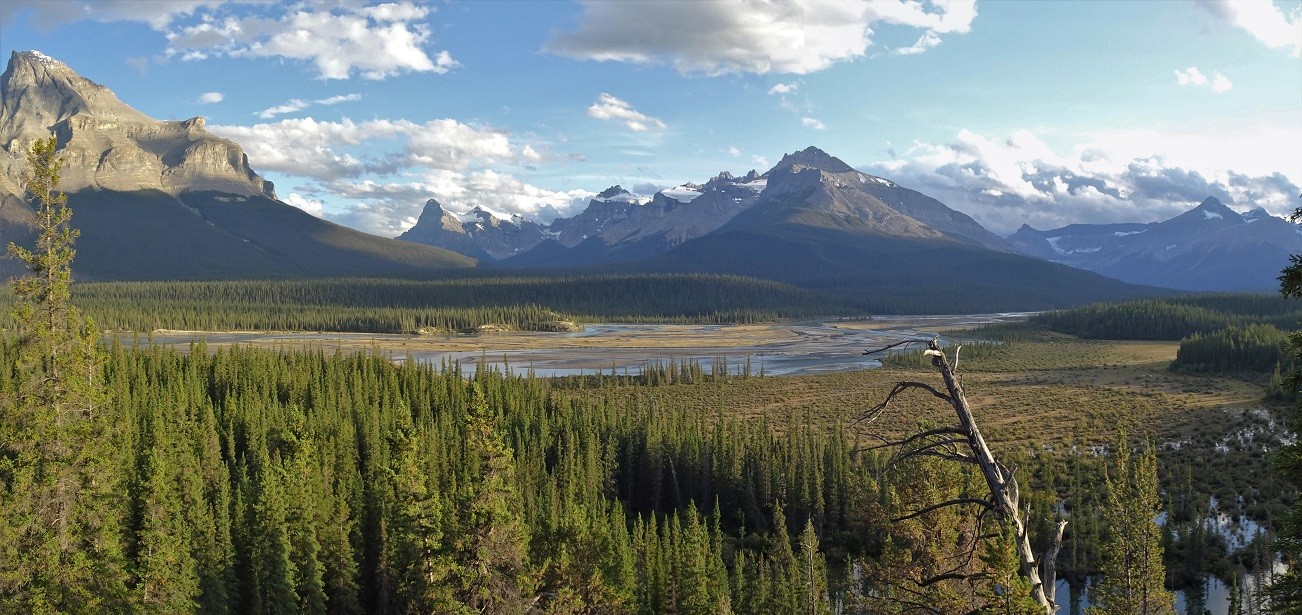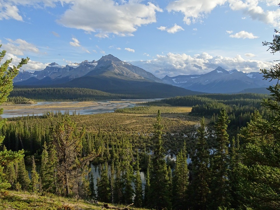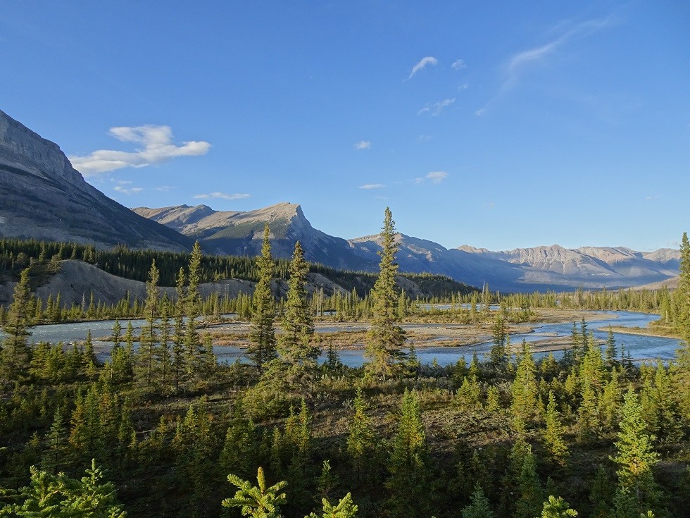 Bij de eerste picknickplaats die we tegen komen gaan we lunchen, want dat hebben we nog niet gedaan. Het is op een camping aan het water. Wat nieuwe brandstof gaat er wel in. Het was mooi, maar alle energie is op. Als we de auto instappen begint het te regenen. We besluiten om in één keer door te rijden naar het hotel om bij te komen van alle inspanningen en later op de dag nog een keer op pad te gaan. De zon is alweer gaan schijnen en wat is het hier prachtig. Het is jammer om dit over te slaan. The Crossing resort is een sfeervol motel gelegen in de natuur met uitzicht op de bergen. De kamers zijn klein en knus. We gaan allemaal op bed liggen en doen een dutje. Het is een goede keuze geweest om naar het hotel te gaan, want het komt met bakken uit de lucht. Als het weer is opgeknapt en wij nieuwe energie hebben gaan we naar buiten toe. Als het mooi weer is moet je buiten spelen. Je weet nooit wat voor weer je morgen krijgt is ons motto. We rijden eerst naar Mistaya Canyon. Een wandelpad van 300 meter brengt ons naar een uitzichtpunt. Wat we niet wisten is dat het ook bultje af gaat. Dat vernemen de benen wel. Het uitzicht is prachtig. Daarna rijden we door tot Waterfowl Lakes waar de ondergaande zon op de bergen schijnt. Net voordat we bij het hotel komen steken we de Saskatchewan River over. Dit komt regelrecht uit een plaatjesboek. Het enige wat ontbreekt zijn kuddes wilde dieren. Ze passen zo mooi in dit plaatje. Als allerlaatste stoppen we bij Howse & Mistaya River Viewpoint. De laatste zonnestralen verlichten de bergen en het dal waar de rivier door stroomt. Dit is echt de kers op de taart. Dit had ik absoluut niet willen missen. Om acht uur zijn we terug bij het hotel en halen Edgar en Joran op om te gaan eten. Zij hebben alweer uren geslapen. We gaan voor het buffet en genieten vooral van het verse fruit en de toetjes. Edgar heeft een migraine aanval en gaat terug naar de kamer. Hopelijk doet een nacht slapen hem goed.